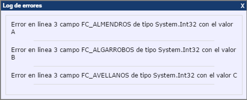 Por otro lado, si intentamos abrir una declaración que contenga alguna tabla no soportada o con formato XML incorrecto, se producirá un error y se notificará mediante la ventana de log de errores. Por ejemplo: