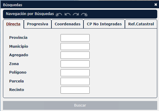 El formulario de búsquedas incluye una barra de Navegación por Histórico, que permite al usuario navegar por las búsquedas realizadas (primera, anterior, siguiente, última) previamente, sin la necesidad de volver a rellenar los parámetros de búsqueda.